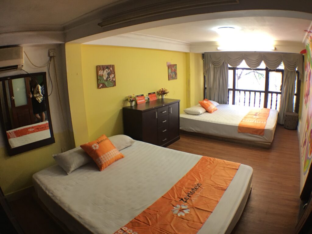 Phòng rộng với 2 giường đôi, view phố, thích hợp đi nhóm hoặc gia đình. Khu bếp ăn xinh xắn.